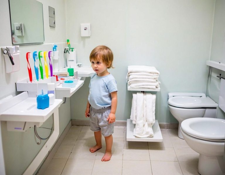 Ein Sanitärbereich mit individuellen Pflegestationen für jedes Kind spielt eine entscheidende Rolle in der Kindertagesbetreuung, da er nicht nur die persönlichen Hygienebedürfnisse der Kinder berücksichtigt, sondern auch ihre Selbstständigkeit fördert. Jede Pflegestation ist liebevoll ausgestattet mit einem Handtuch, einer Zahnbürste und persönlichen Pflegeutensilien, die es dem Kind ermöglichen, selbstständig und in Ruhe die tägliche Hygiene zu praktizieren. Die Stationskonfiguration sorgt dafür, dass jedes Kind seinen eigenen Bereich hat, was ein Gefühl von Sicherheit und Privatsphäre vermittelt. Dies hilft den Kindern, Verantwortung für ihre eigene Sauberkeit zu übernehmen und selbstbewusst in der Gruppe aufzutreten. Der Sanitärbereich wurde so gestaltet, dass er spielerisch und einladend wirkt, wodurch die Kinder motiviert werden, regelmäßige Hygieneroutinen zu entwickeln und zu pflegen. So wird nicht nur die körperliche Gesundheit gefördert, sondern auch die soziale Interaktion, während die Kinder lernen, sich um sich selbst zu kümmern und gleichzeitig gegenseitig zu unterstützen.