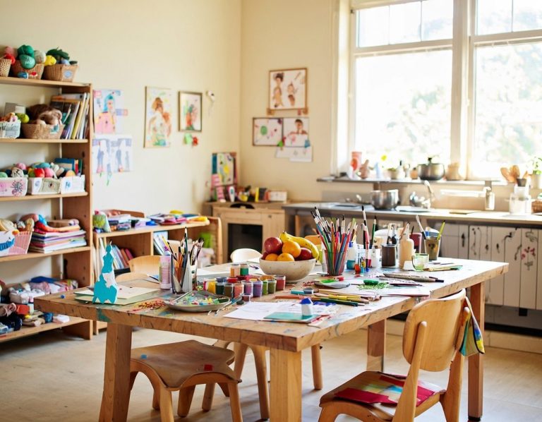 Ein inspirierender Bastel- und Kreativbereich, der die Fantasie entfaltet und Feinmotorik sowie kreativen Ausdruck fördert. Hier, genauso wie im einladenden Essbereich der Küche, genießen wir unsere täglichen Mahlzeiten in einer harmonischen und liebevollen Atmosphäre. Lass uns gemeinsam die Freude am Schaffen und das Zusammensein zelebrieren!