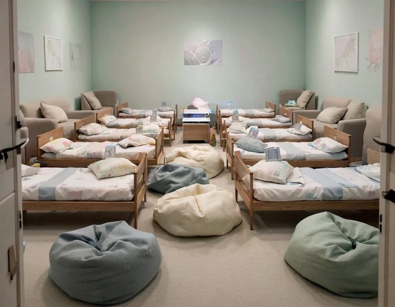 Ein separater Schlafraum mit zehn festen, persönlich zugeordneten Schlafplätzen. Der Raum ist mit kindgerechten Matratzen, Sitzsäcken, einem CD-Player für ruhige Musik sowie einer Sitzmöglichkeit für die Schlafbegleitung ausgestattet und bietet eine geschützte Atmosphäre für Ruhe und Entspannung.