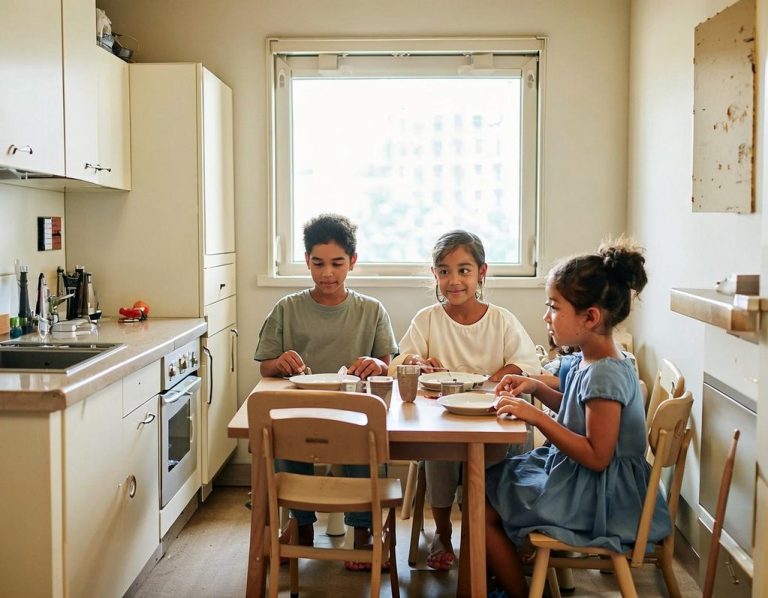 Eine gut gestaltete Küche mit einem separaten, kindgerecht eingerichteten Essbereich ist ein zentraler Bestandteil der Kindertagesbetreuung. In solch einem Raum können die Kinder nicht nur gemeinsam essen, sondern auch lernen, gesunde Essgewohnheiten zu entwickeln. Der Essbereich ist mit kleinen, bunten Möbeln ausgestattet, die speziell auf die Größe und Bedürfnisse der Kinder abgestimmt sind. Tische und Stühle sind spielerisch gestaltet, um eine einladende Atmosphäre zu schaffen und das Interesse der Kinder zu wecken. Dieser Bereich fördert nicht nur das gemeinsame Essen, sondern auch soziale Interaktionen, da die Kinder lernen, miteinander zu reden und ihre Mahlzeiten zu teilen. Darüber hinaus wird der Essensbereich so organisiert, dass die Kinder aktiv in die Zubereitung der Mahlzeiten einbezogen werden können. Solche Erfahrungen stärken das Verantwortungsbewusstsein der Kinder und fördern ihre Kreativität, während sie gleichzeitig genießen, miteinander zu essen und neue Geschmäcker zu entdecken. Eine kinderfreundliche Küche und Essbereich unterstützen somit nicht nur die Nahrungsaufnahme, sondern auch die Entwicklung sozialer und motorischer Fähigkeiten der Kinder.